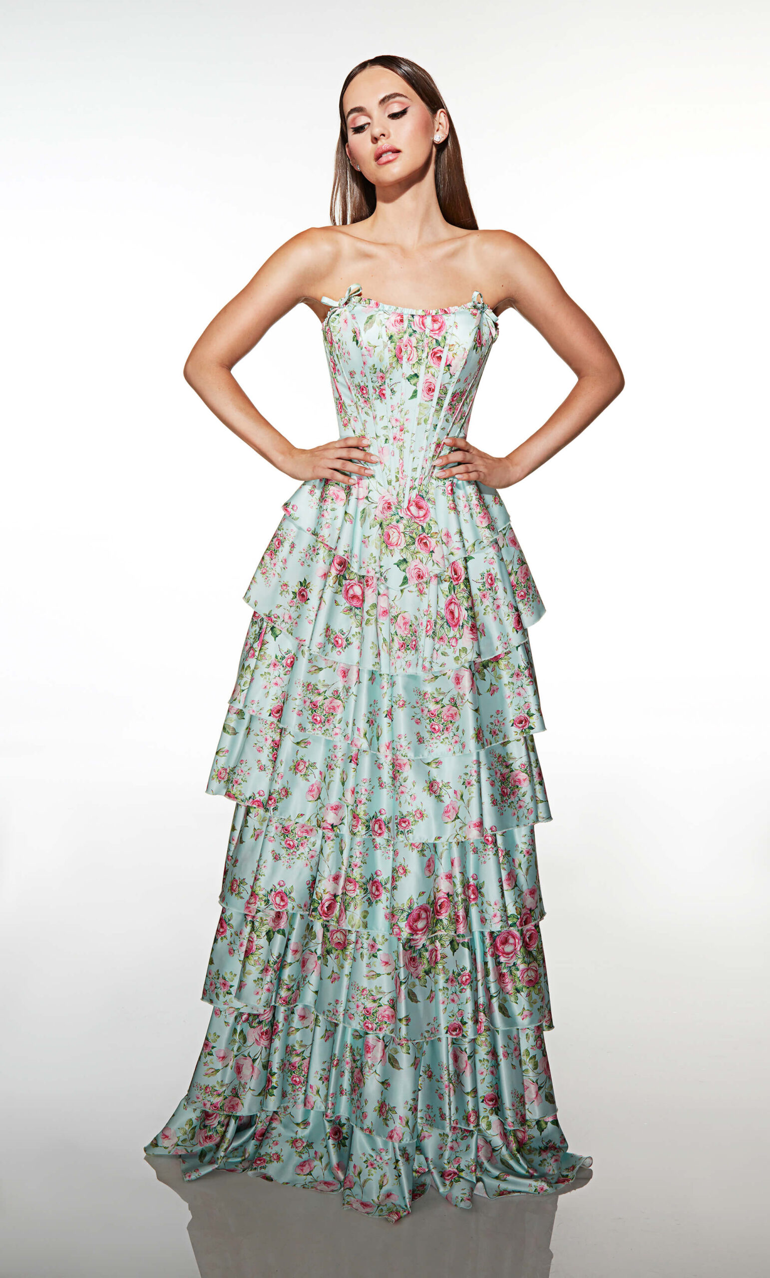 This Alyce Paris floral prom dress is a dreamy statement piece designed for the prom girl who loves romantic details with a fashion-forward silhouette. The structured corset bodice creates a flattering, supportive fit while highlighting the waist and neckline with delicate floral print throughout.