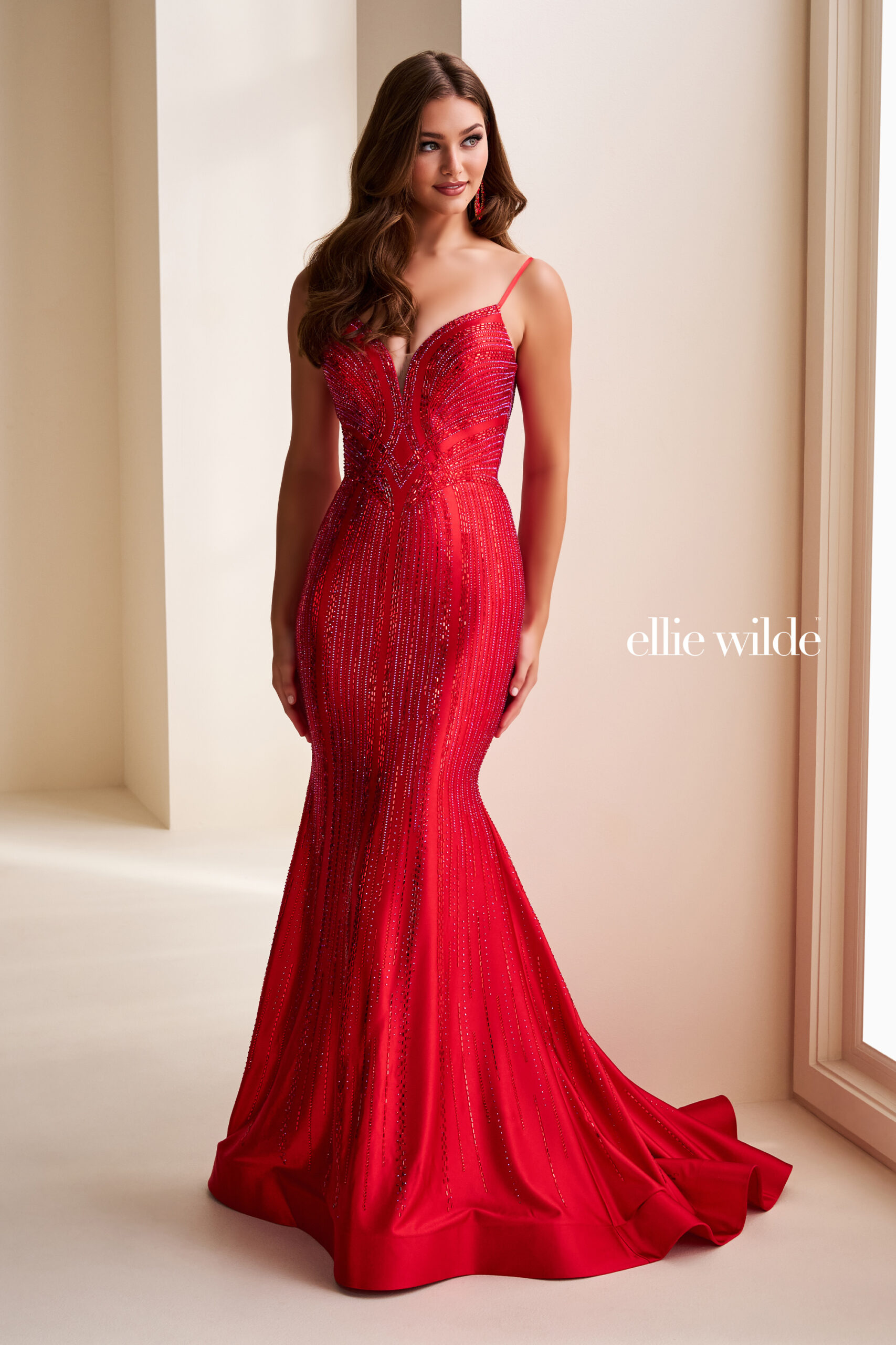 Turn every head in this stunning Ellie Wilde red beaded mermaid prom dress. Designed for the bold and confident, this gown features a plunging illusion neckline, delicate spaghetti straps, and a body-contouring silhouette that glimmers from every angle.