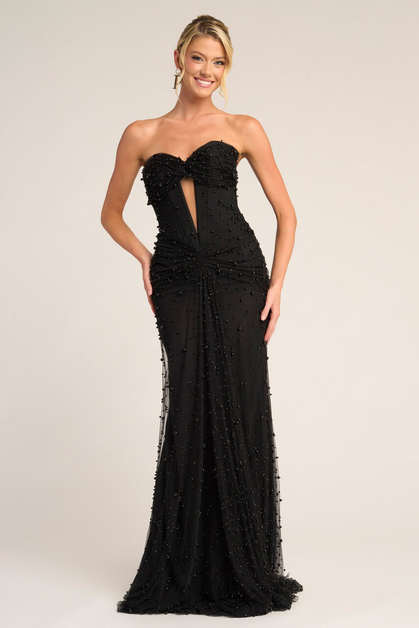 This black strapless prom dress delivers understated glamour with a modern edge. Designed with a softly draped bodice, delicate allover beadwork, and a sheer keyhole detail at the center front, this gown creates a flattering, sculpted silhouette that feels effortlessly chic. The fitted skirt flows smoothly to the floor, offering elegant movement while maintaining a clean, timeless look. Perfect for the prom girl who loves classic black with a subtle hint of drama, this gown is equal parts confident and refined.