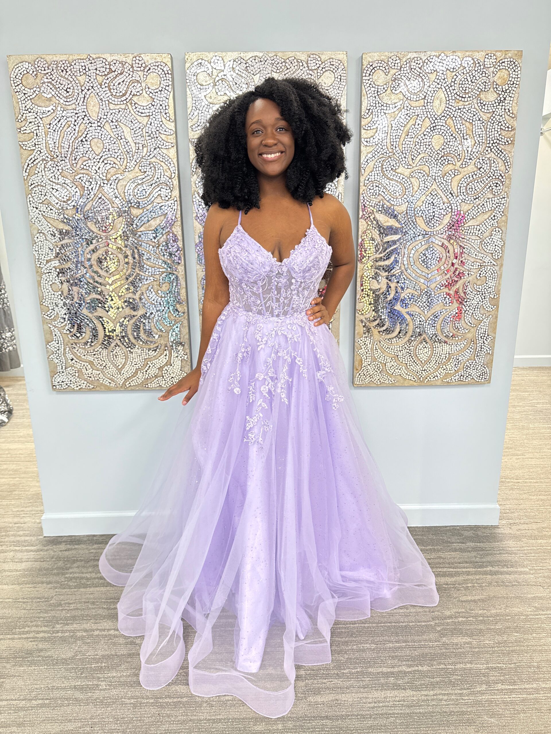 Romantic and effortlessly elegant, this True Blue Exclusive lavender corset prom dress is available only at Blue by Atlas Bridal in Toledo, Ohio. The structured lace corset bodice is beautifully detailed with floral appliqués and subtle sparkle, offering a flattering, supportive fit with a soft feminine feel.