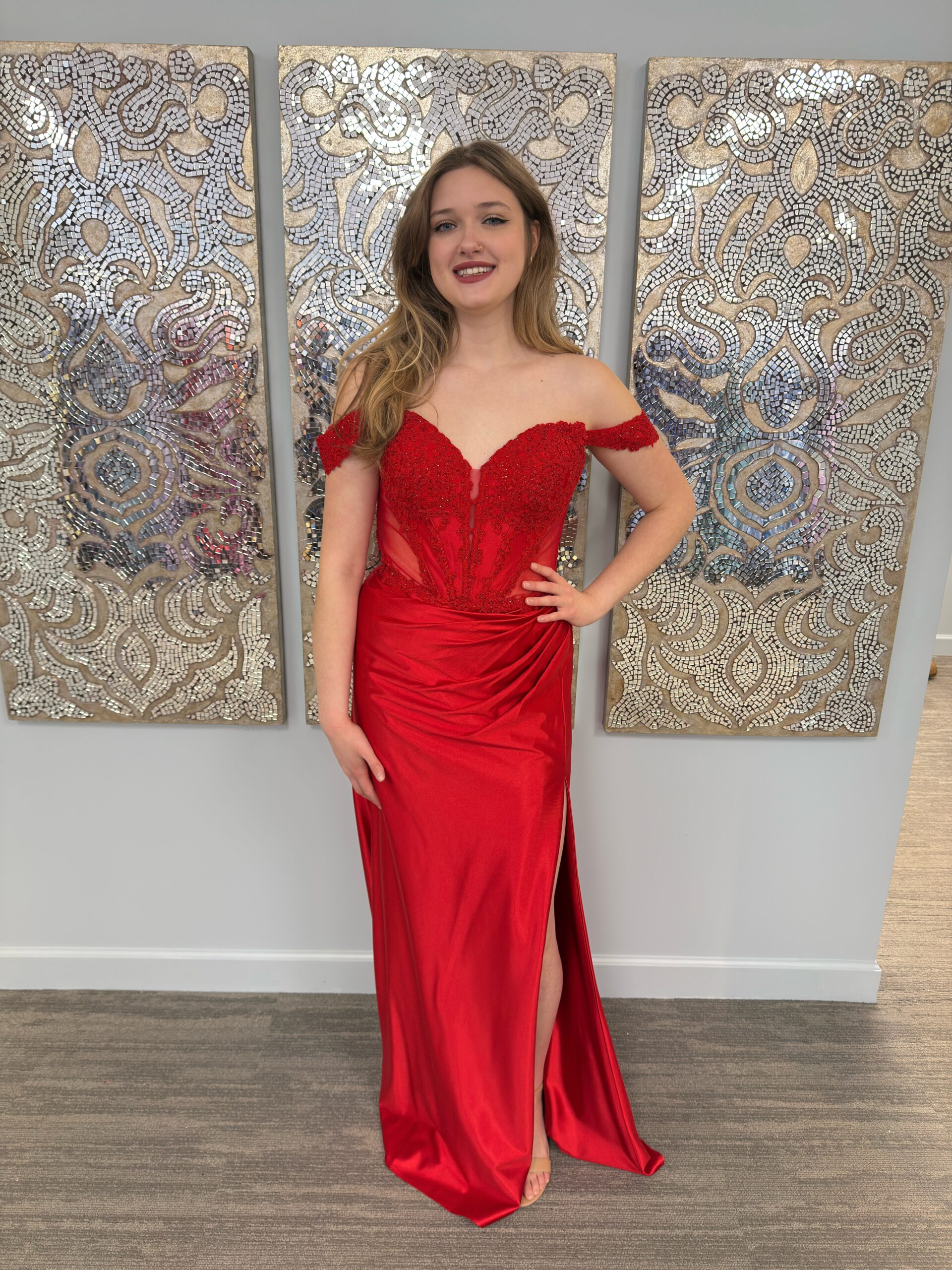 The fitted satin skirt drapes effortlessly through the hips and thighs, finished with a high leg slit for just the right amount of drama. Rich crimson fabric catches the light with every step, making this gown unforgettable from every angle.
