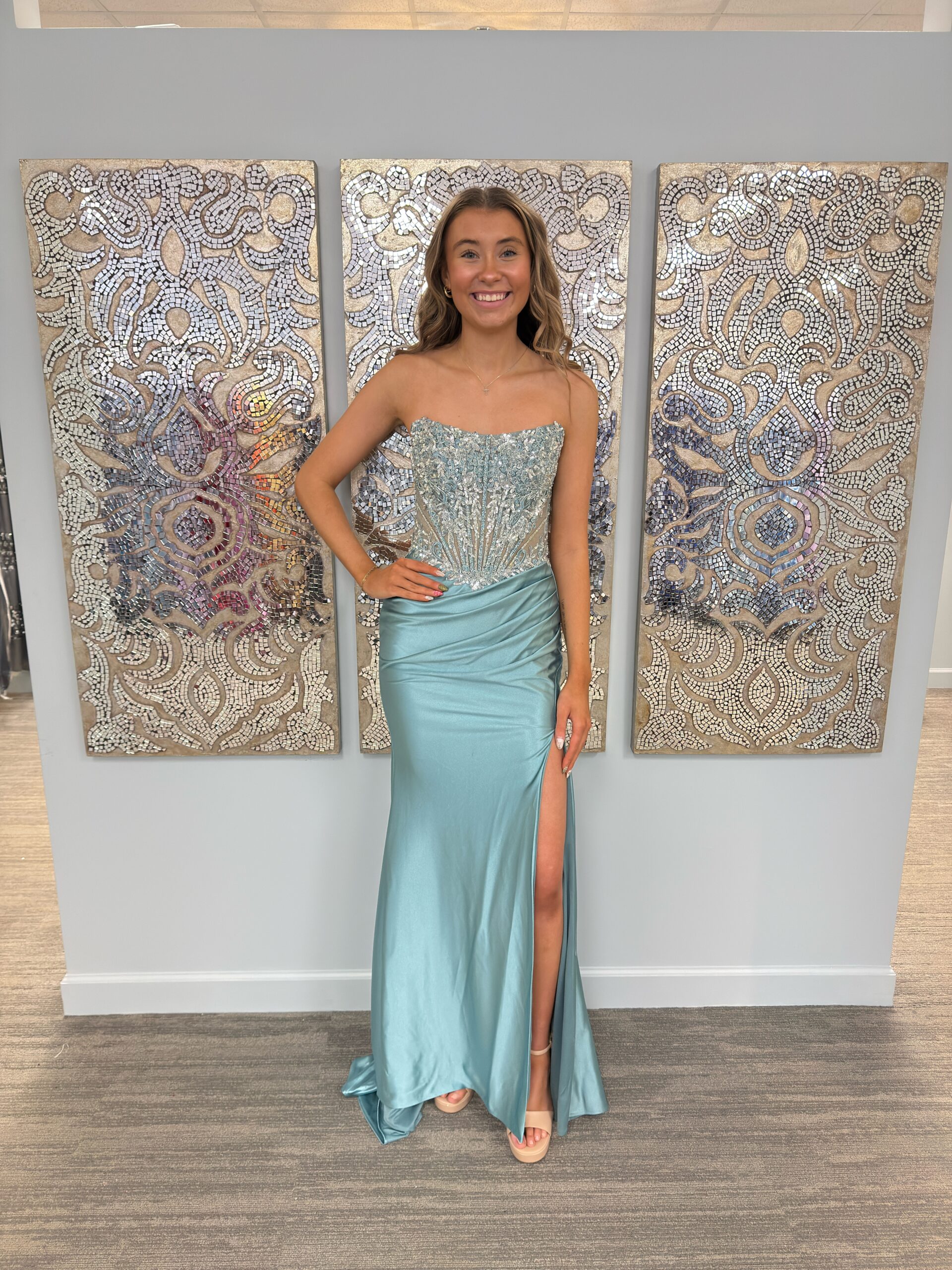 A seafoam strapless prom dress with a crystal-beaded bodice, fitted satin skirt, and thigh-high slit. True Blue Exclusive.