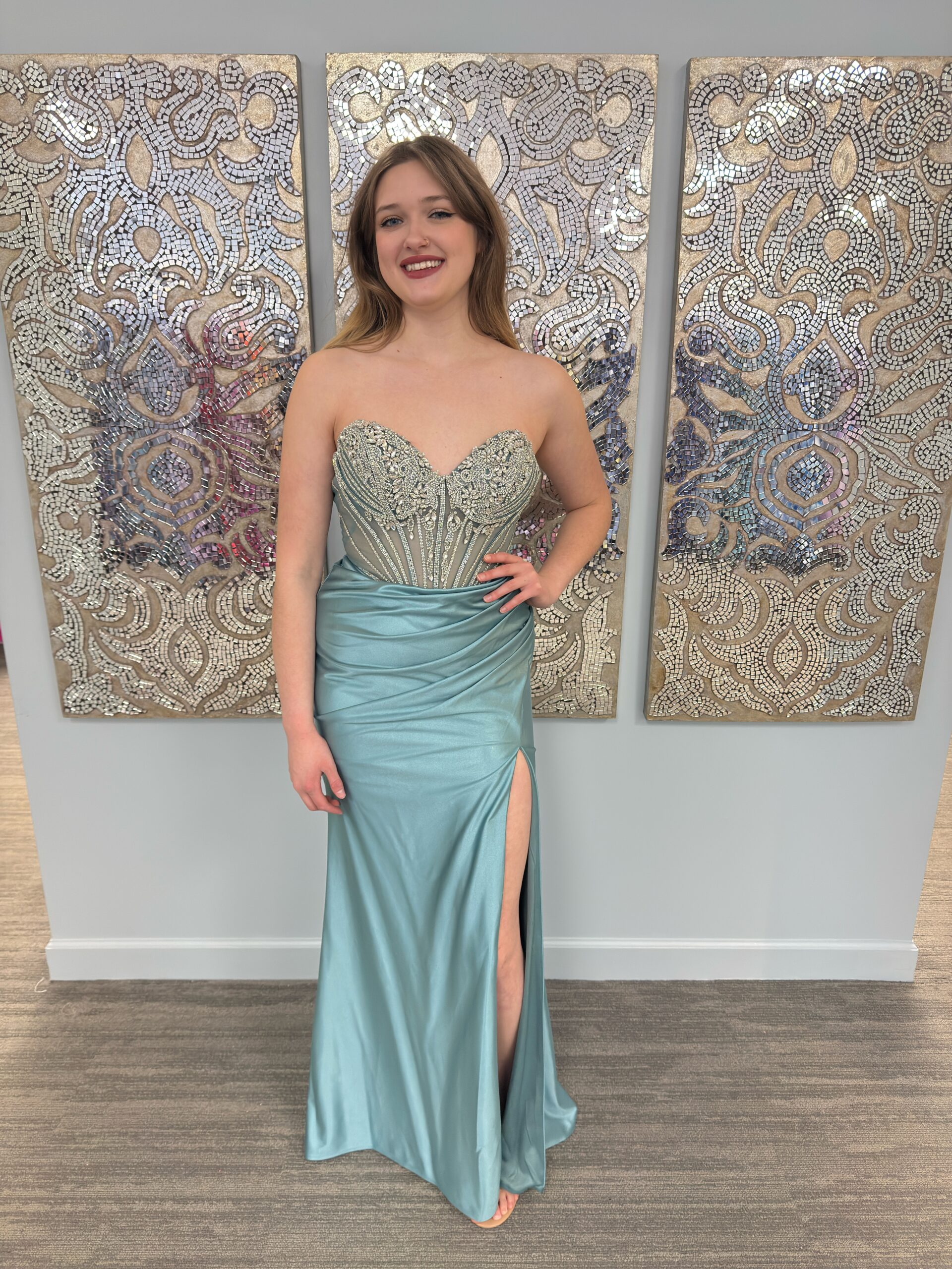 The strapless sweetheart neckline adds a romantic touch, while the soft satin skirt drapes beautifully over the hips for a smooth, elongating look. A dramatic thigh-high slit brings modern edge and movement, making this gown perfect for prom night or any formal occasion where you want to stand out.