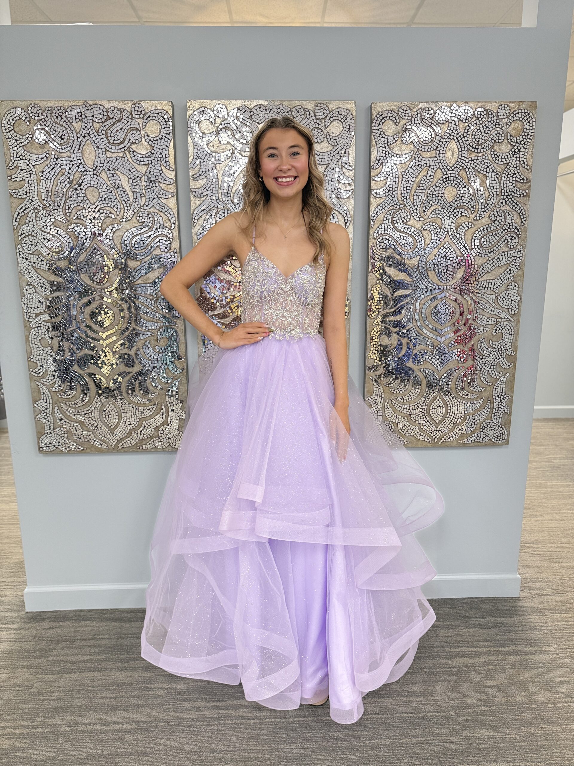 Whimsical and effortlessly elegant, this True Blue Exclusive lavender beaded prom dress is available only at Blue by Atlas Bridal in Toledo, Ohio. The fitted bodice is adorned with shimmering beadwork that catches the light beautifully, while delicate spaghetti straps create a soft, feminine neckline.