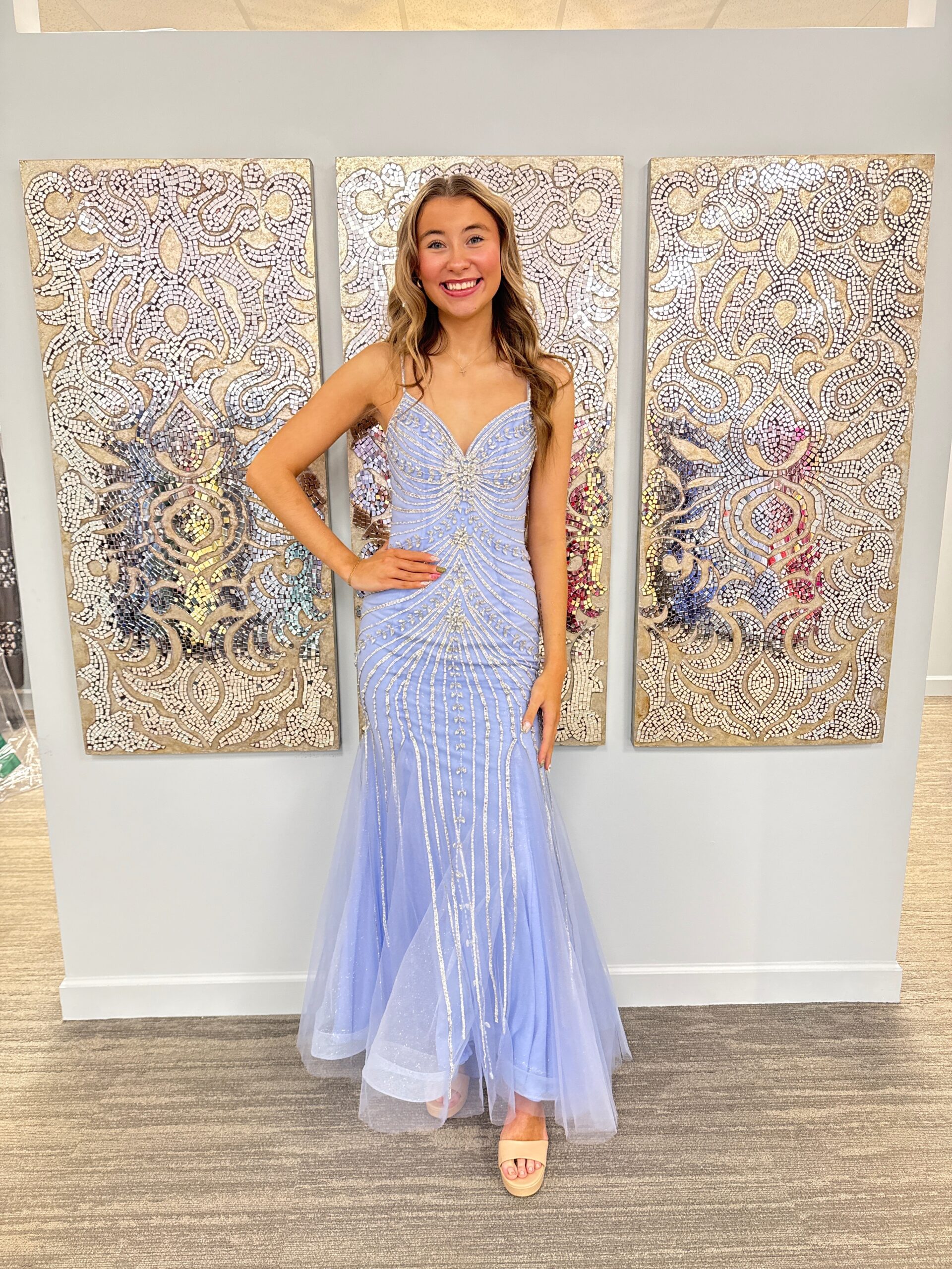 A stunning True Blue Exclusive light blue prom dress featuring intricate beading, delicate spaghetti straps, and a soft tulle skirt for an elegant, flattering silhouette.