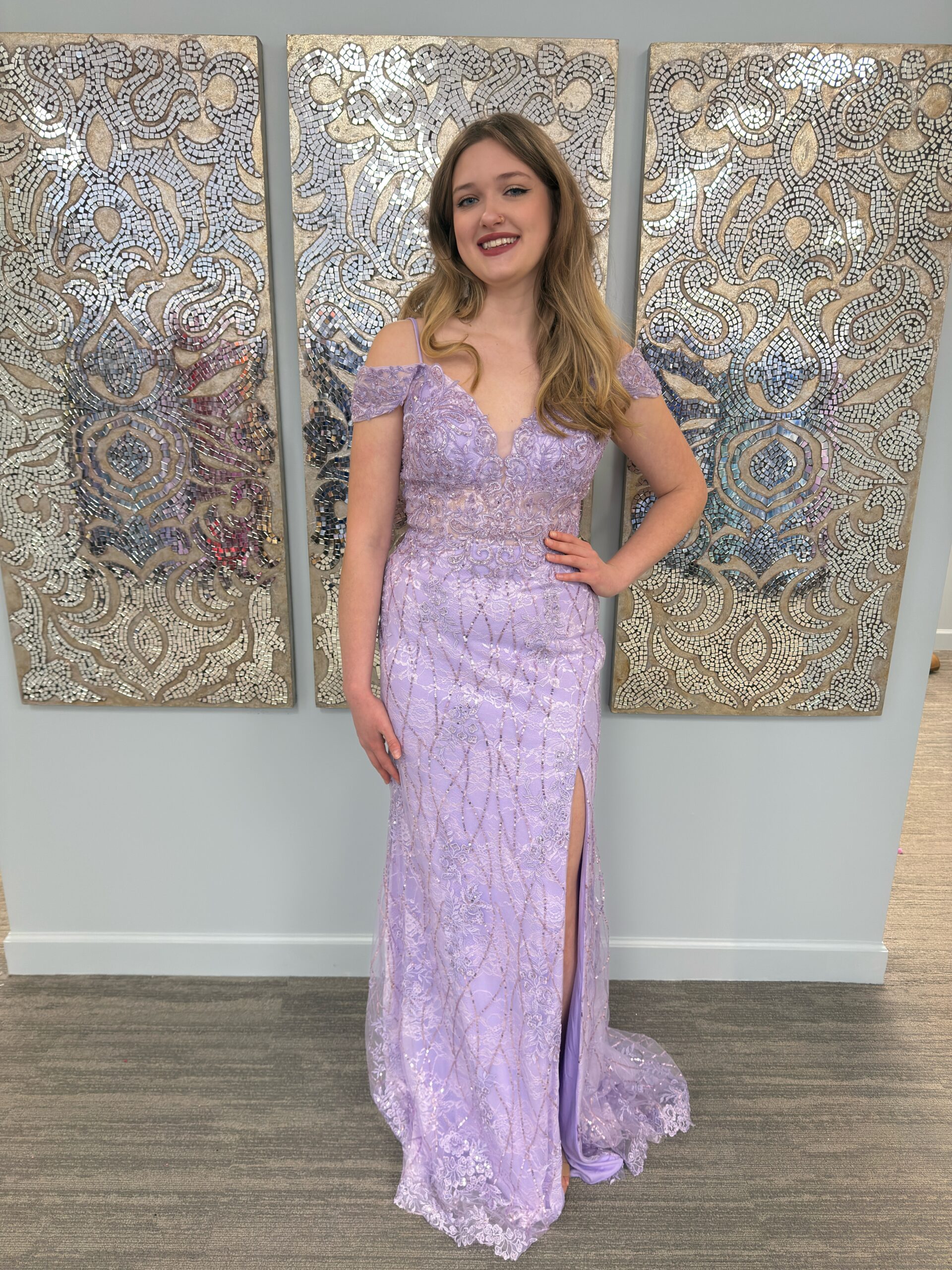 This lavender prom dress features a delicately detailed lace bodice with off-the-shoulder straps that frame the neckline beautifully. The fitted silhouette hugs through the waist and hips, while the floor-length skirt flows effortlessly and finishes with a subtle thigh-high slit for movement and confidence. Intricate lace detailing throughout adds texture and dimension, making this gown just as stunning up close as it is across the room.
