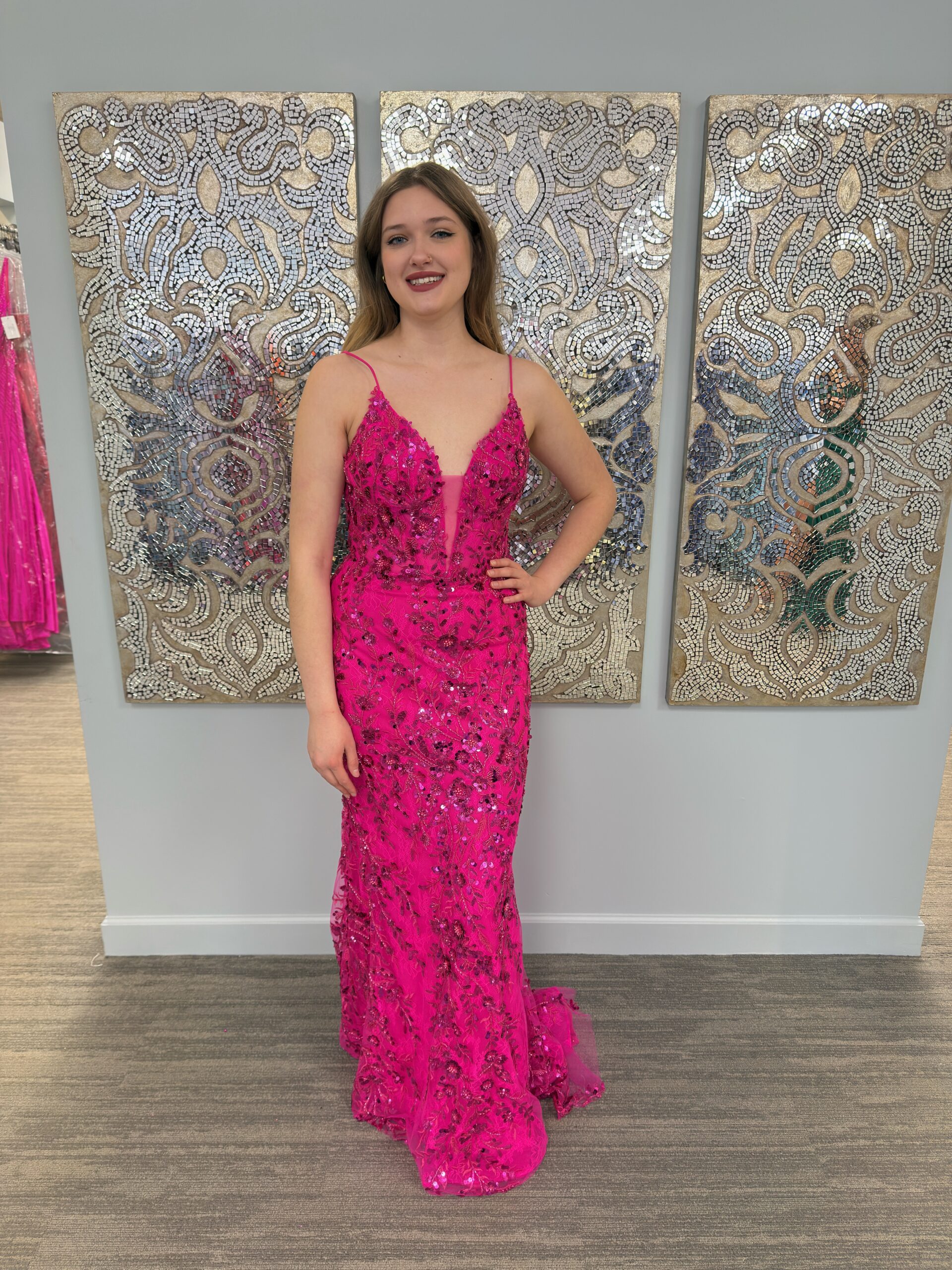 This gown features a plunging deep V neckline with illusion mesh for support, paired with delicate spaghetti straps that keep the look light and modern. Intricate beadwork and shimmering sequins are layered over a vibrant fuchsia base, creating nonstop sparkle from every angle. The fitted silhouette hugs the body beautifully before flowing into a floor-length skirt that moves effortlessly across the dance floor.