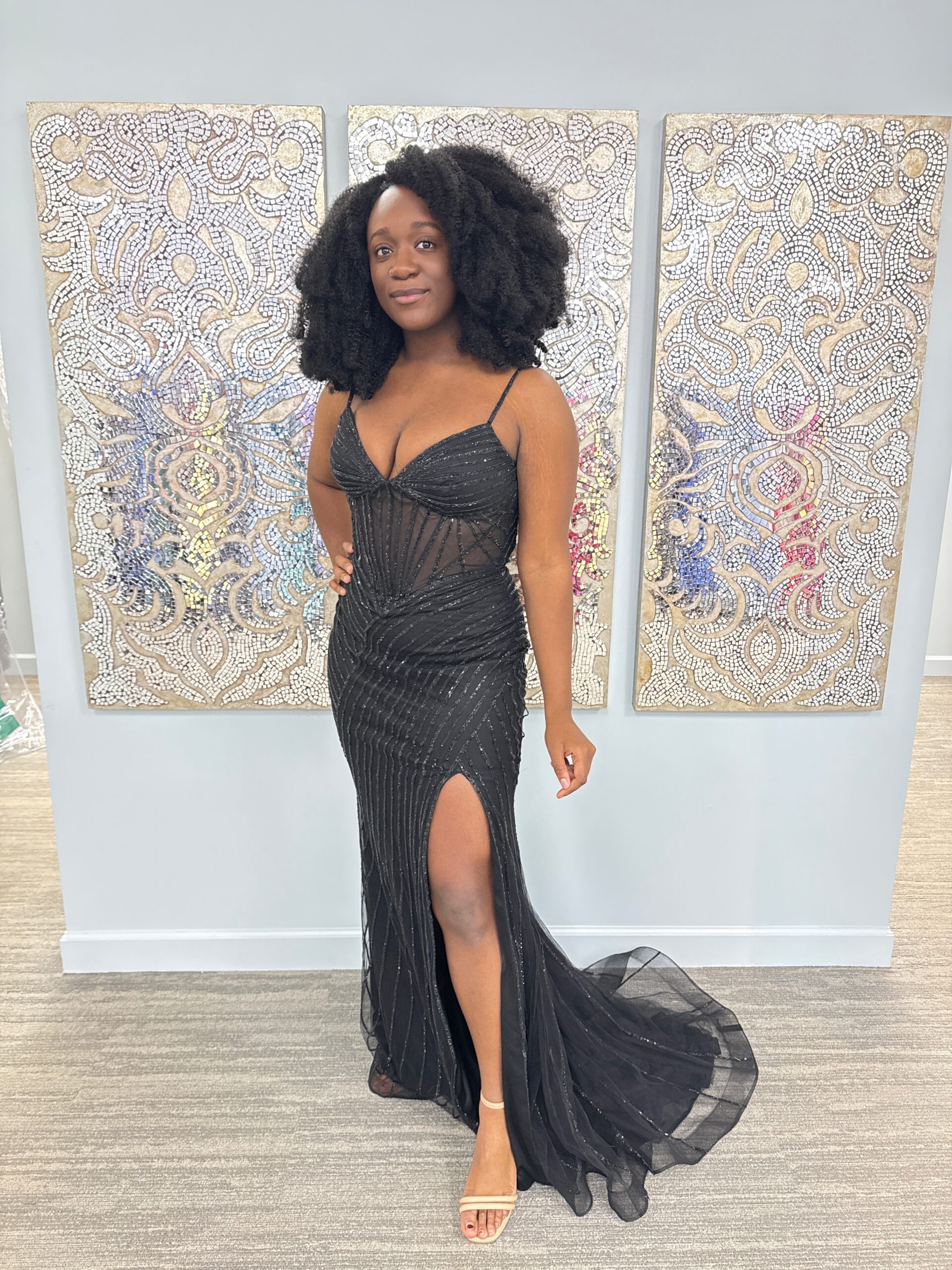 Confident, elegant, and undeniably striking, this True Blue Exclusive black beaded corset prom dress is available only at Blue by Atlas Bridal in Toledo, Ohio. Designed to sculpt and flatter, the gown features a sheer corset bodice with intricate vertical beadwork that defines the waist and creates a stunning hourglass silhouette.